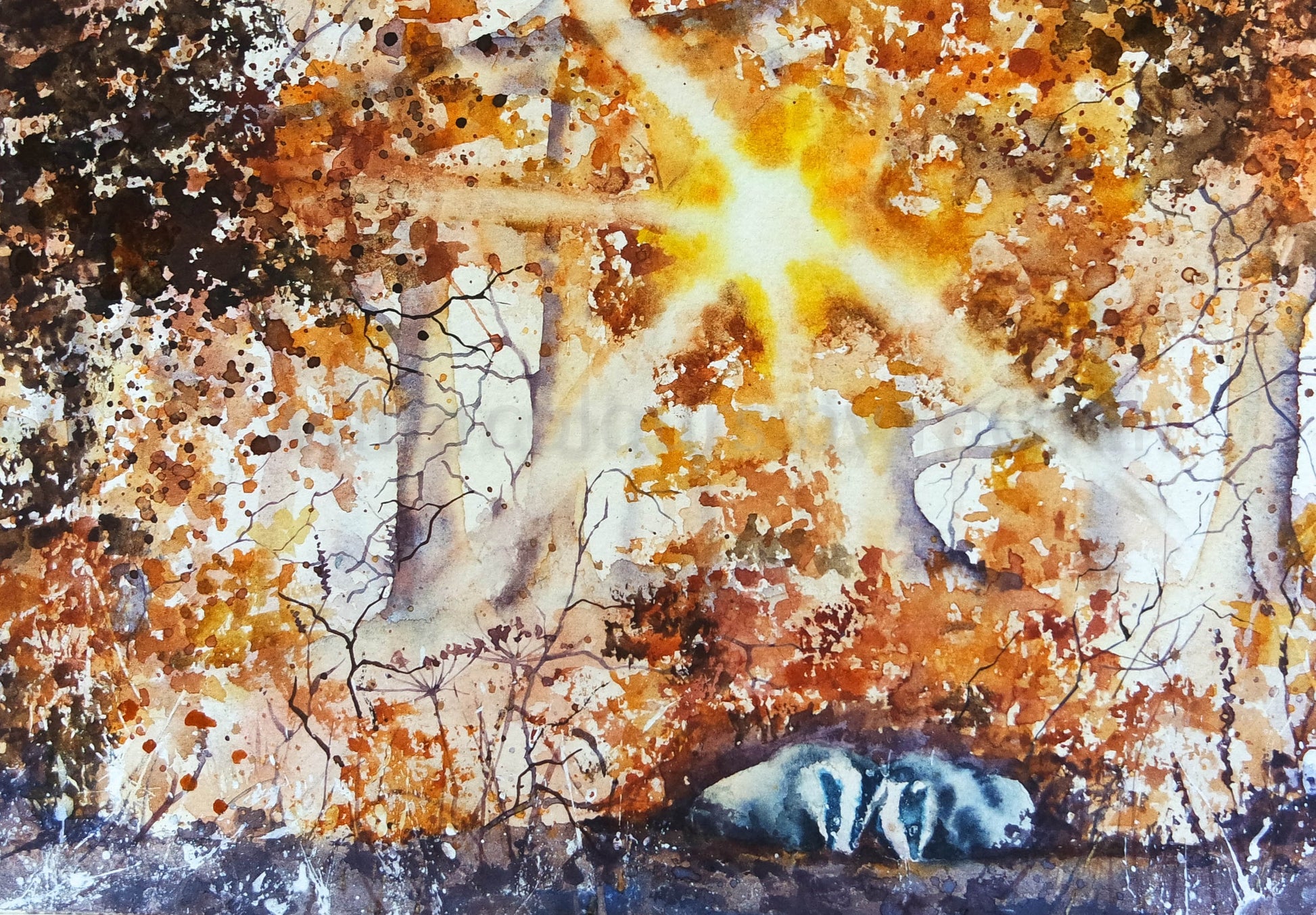 An original watercolour of a woodland glade, in autumn, with two badgers hidden amongst the leaves
